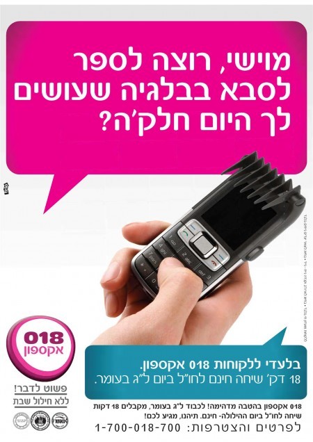 ל”ג בעומר כבר עבר, אבל חוצניק הבטיח בליל שישי שנעלה את המודעה הזאת השבוע, אז הנה היא. אמנם הוא מאוד חיבב אותה, אבל גם אחרי שלל המחמאות שטריו קצרו מאיתנו טרום חג הפסח, הפעם אני ממש לא מתחבר. אולי זה הצבעים המתאימים יותר לתסרוקת אצל הפאנית מאשר חלק’ה במירון, אולי זה החיבור בין מכונת תספורת למכשיר סלולרי, כשר כמובן, שלא אהבתי. אולי.