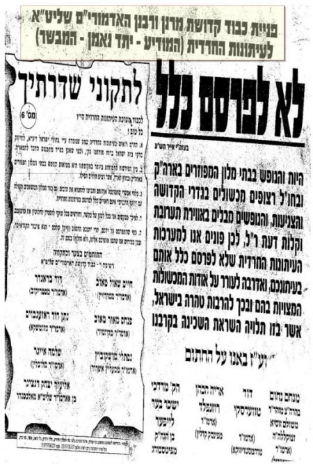 - הרבה כתרים קשרו לראשם של מנהלי עיתון ‘המבשר’ בהצלחה השיווקית המדהימה, אבל מה שבטוח, יש עיתונים שמלאכתם נעשית על ידי אחרים. פאשקעווילים שהיו על קירות המודעות לפני כשבועיים קראו לעיתונות החרדית, קרי; המודיע – יתד נאמן – המבשר, לא לפרסם כלל אודות הנופש בבתי מלון. מי צריך יותר מזה?