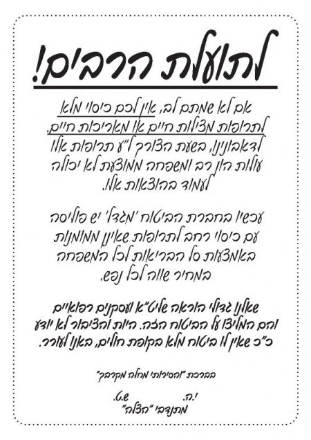 בליל שבת האחרון נחשפתי למודעה ‘לתועלת הרבים’ בלוח המודעות בבית הכנסת הסמוך לביתי. לא הייתי זקוק לקרדיט כדי לנחש שמדובר בפעולת גרילה של תוצאות אפקטיביות. אי אפשר להתבלבל, ברור נו. אז תראו איך מלווים קמפיין שלא כלול בתקציב של סל הבריאות. רבוייסי, מגיע לכם צל”ש אישי מליצמן.