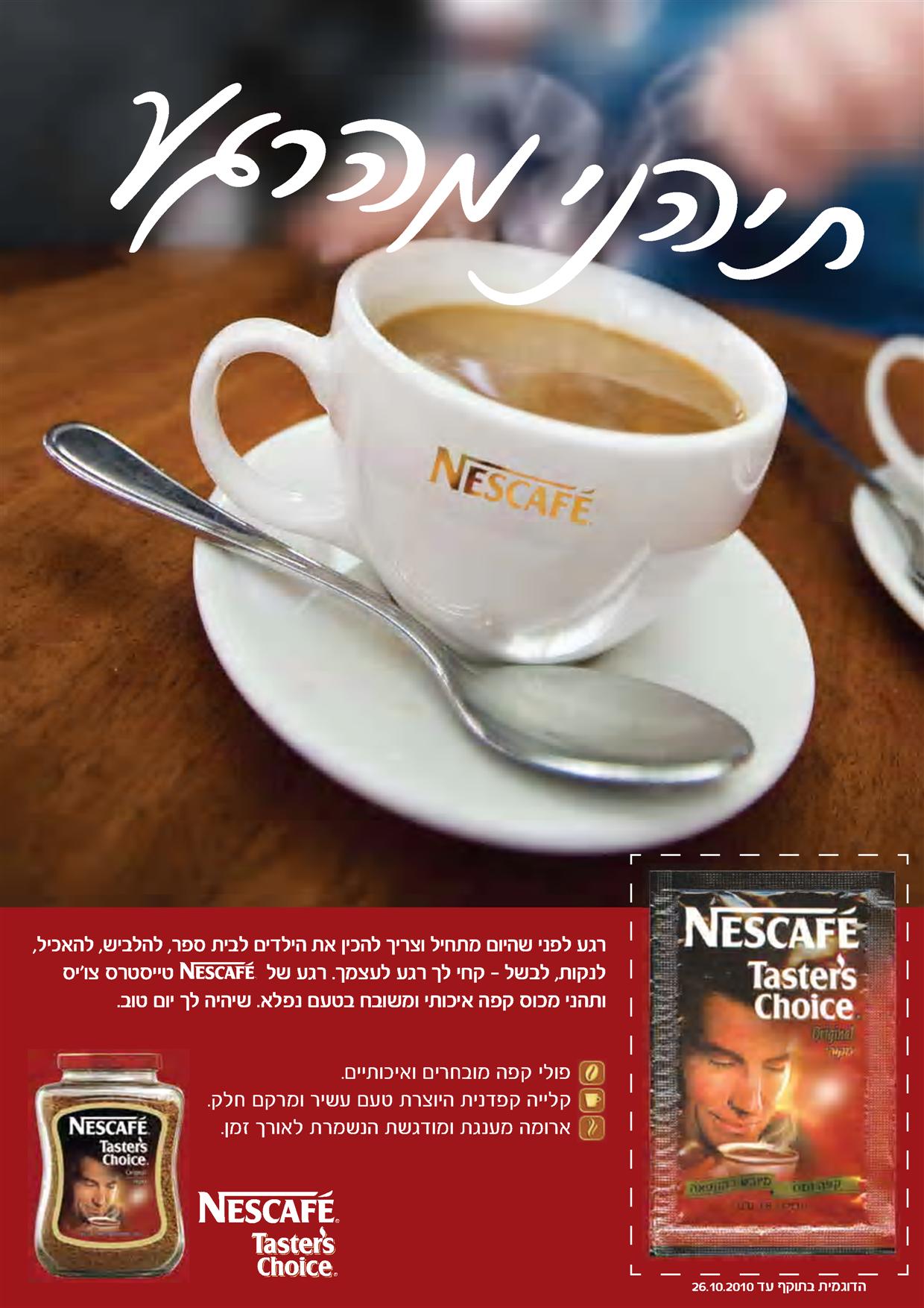 ככה לפני שהיום שלכם מתחיל, קחו כוס קטנה עם כפית גדושה של טסטרס’ צ’ויס, עוד כפית סוכר, לשפות מים רותחים מאוד, לבחוש, להוסיף קצת חלב קר, וללגום. אההה. ככה אני אוהב להתחיל את הבוקר, עם מנת קפאין ממכרת. בשבוע האחרון חולקו למעלה מ 120,000 אינסרטים מיוחדים של הקפה האהוב עלי בעיתונים היומיים. עוד שבועיים, ככה מספרים לנו, הולך לעלות הקמפיין המלא לעיתונות. עד אז תיהנו מהרגע. מקפה טוב.