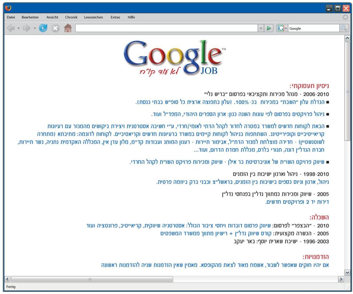 בחור נחמד בשם יוסי עלוש, הלומד בשלוחה החרדית של ‘הבצפר’ שלח לנו קורות חיים עם טוויסט מיוחד. לאחר בירור קצר מתברר שלא רק אנחנו זכינו לקרוא את הקו”ח שלו, אלא גם שאר הקודקודים בעולם הפרסום החרדי, קיבלו קו”ח הממוענים ישירות אליהם. אנחנו מאחלים לו בהצלחה, ומקווים שימצא מקום שיתן לו לשבור כמה חוקים.