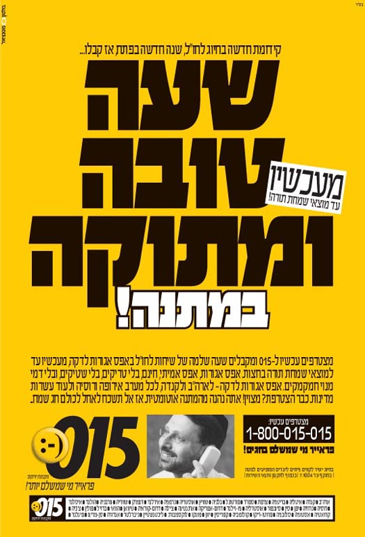 בלי טריקים בלי שטיקים. סמייל אינטרנט זהב בגלגולה הראשון עם הקידומת 015, מאחלת שנה טובה ומתוקה באמצעות משרד הפרסום בולטון פוטנציאל / 2004. אם תשימו לב לבודי טקסט של המודעה, תמצאו שורה שמזכירה מאוד את הקונספט הנוכחי של סמייל 012, שילוב של אינטרנט זהב ו – 012 שהתאגד בשנת 2007. אבל נו, זה סתם כי בא לי לקשקש.