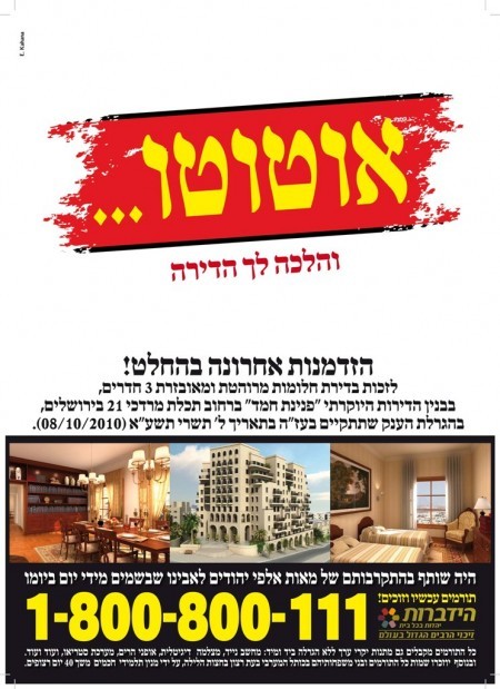 והפעם, לקינוח אחרון (ואולי לא), אין כמו האיום החד עם מבט ישיר לעיניים ולכיס המתרוקן: חבוב, הזדרז, ‘אוטוטו, והלכה לך הדירה’. רק ניסיתי לחשוב על יצרנית הרכב פיאט, שהייתה מנסה לשכנע בקניית פונטו בדיל הזול, כי ‘אוטוטו, והלך לך האוטו’. מחשבתי הייתה מתקבעת על פשיטת רגל ממשמשת ובאה. (ולענינינו, על קרחון בעקבות מבול הדירות: ‘המבשר’, ‘יגדיל-תורה’, ‘תולדות-אברהם-יצחק’, ‘כולל חצות’, ומי לא). אך להתפעתי כי רבה, ב’הידברות’ טוענים, ואני מצטט: “קמפיין האוטוטו הביא יותר תרומות מכל הקמפיינים הקודמים”. כוחו של פרסום או תוצאה של עבודת שטח מעולה? אתם תחליטו.