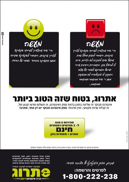 כל אחד טוען להגנה הדוקה יותר. מה שנשאר לנו זה להחליט מי שומר יותר על חומות היהדות הבצורה ממילא. ב’אתרוג’ טוענים שההגנה שלהם היא ברמת הספק, שלא ניתן לעקוף ולפרוץ, כאשר מנגד, ‘נתיב’ מצדדת בהגנה ברמת התוכנה, העדיפה לדבריהם על פני מנוי ‘אתרוג’, אשר יכול במחי שיחה אחת לבטל את החסימה, על ידי שינוי המסלול בשלל מסלולי ‘אינטרנט רימון’. אגב, מבחינת ‘נתיב’, ההישג שהפרסום שלהם התנוסס ביומונים הקשוחים על אף היותו דרבון לאינטרנט הטמא, מספק אותם ברמת ההכרזה על ניצחון חלקי במלחמה, כאשר עובדתית פרסומי ‘אתרוג’ אינם מאושרים שם. ולעניין שלשמו התכנסנו הערב: מבחינה ויזואלית וקריאייטיבית, ‘בראשית’ לוקחים בגדול.
