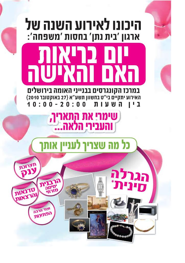 בארגון בית-נתן הפועל להגברת המודעות לבריאות האשה בציבור החרדי, החליטו לערוך יום בריאות מיוחד לאשה החרדית, כאשר כל הכנסותיו יתרמו למען הארגון הנמצא בקשיים. יום הבריאות מופק ע”י חברת אימג’ הפקות ונערך בחסות: מגזין בריא יותר מבית עיתון משפחה, שיחולק למשתתפות הארוע בחינם, וכן על ידי גופים נוספים וביניהם ארגון SUSAN G KOMEN FOUNDATION מארה”ב.